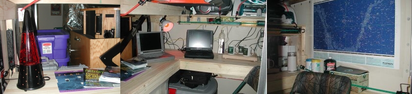 I actually wound up with plenty of table space, room for charts and sketching etc. The office compartment will have a blind which can be pulled down to block light escaping to the rear and to allow for privacy if changing clothes etc. There is a heating unit to warm up on those cold night sessions! The front wall sports a star chart and there is a coffee maker in the corner for those late nights. I plan on doing more work to hide wires and make the overall setup a little more comfortable. There is plenty of storage space below the tables where tents and other camping gear can be stored. The 16” might even fit in the office space for travel. Overall, it is truly amazing what one can pack into a 5’ x 8’ space, especially considering the framing for all this consumed a lot of space in itself. Overall I think I accomplished the goal of quicker observing when arriving to a site. I hope to test it all soon! | |||||||||||||||||||||||||||||||||||||||||