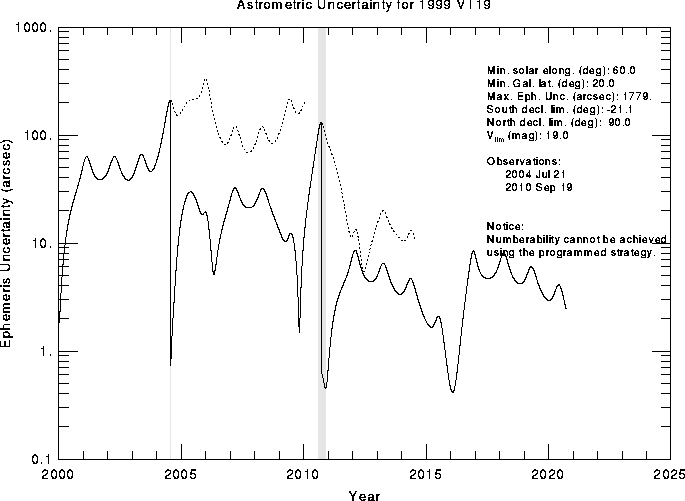 The chart above is used to track the orbit stability of the Asteroid based on the current data from the database. This chart was generated using the Lowell Asteroid Services. | ||||||||||||||||||||||||