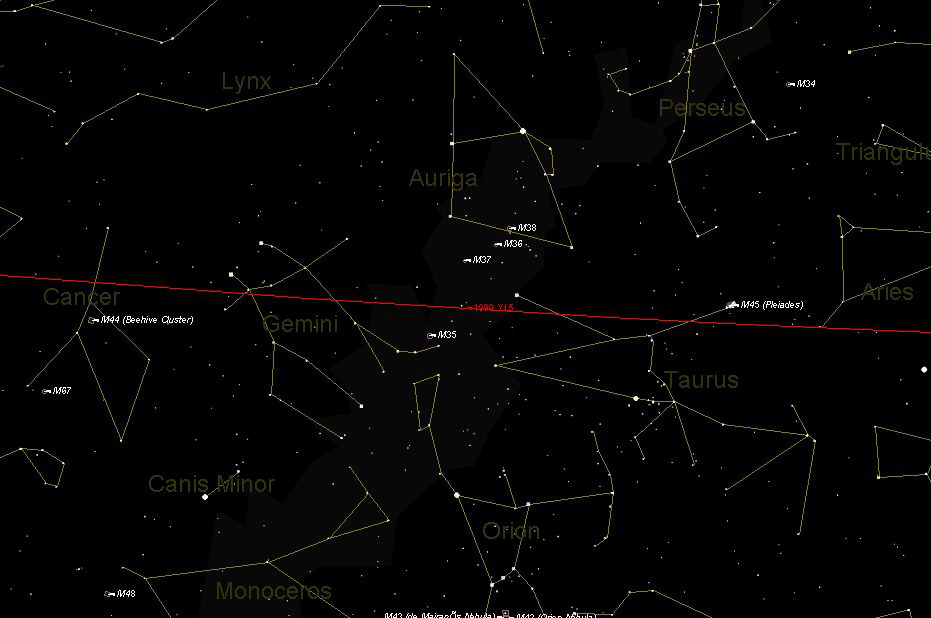 Click on Picture to enlarge, 150KB. This chart depicts the Asteroids orbit and relationship to the constellations. | ||||||||||||||||||||||