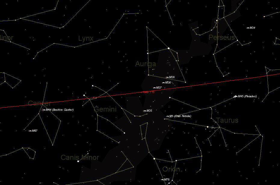 Click on Picture to enlarge, 150KB. This chart depicts the Asteroids orbit and relationship to the constellations. | |||||||||||||||||||||||