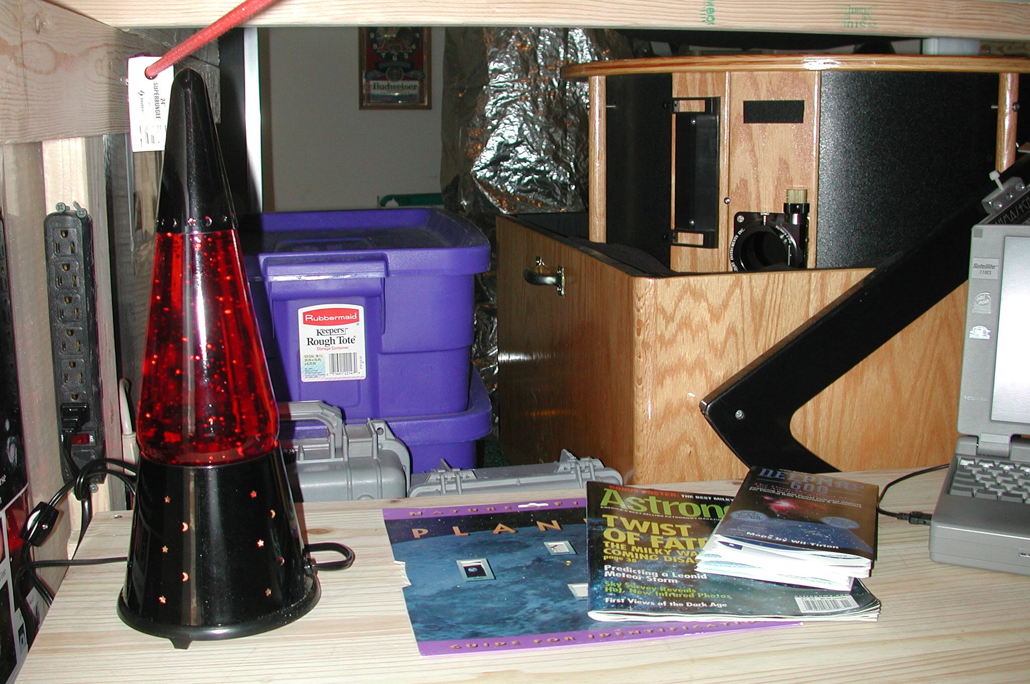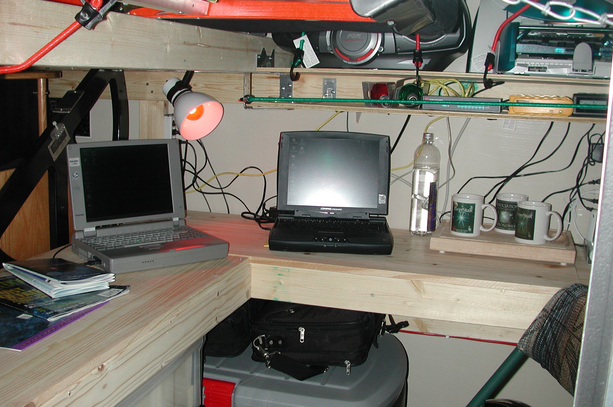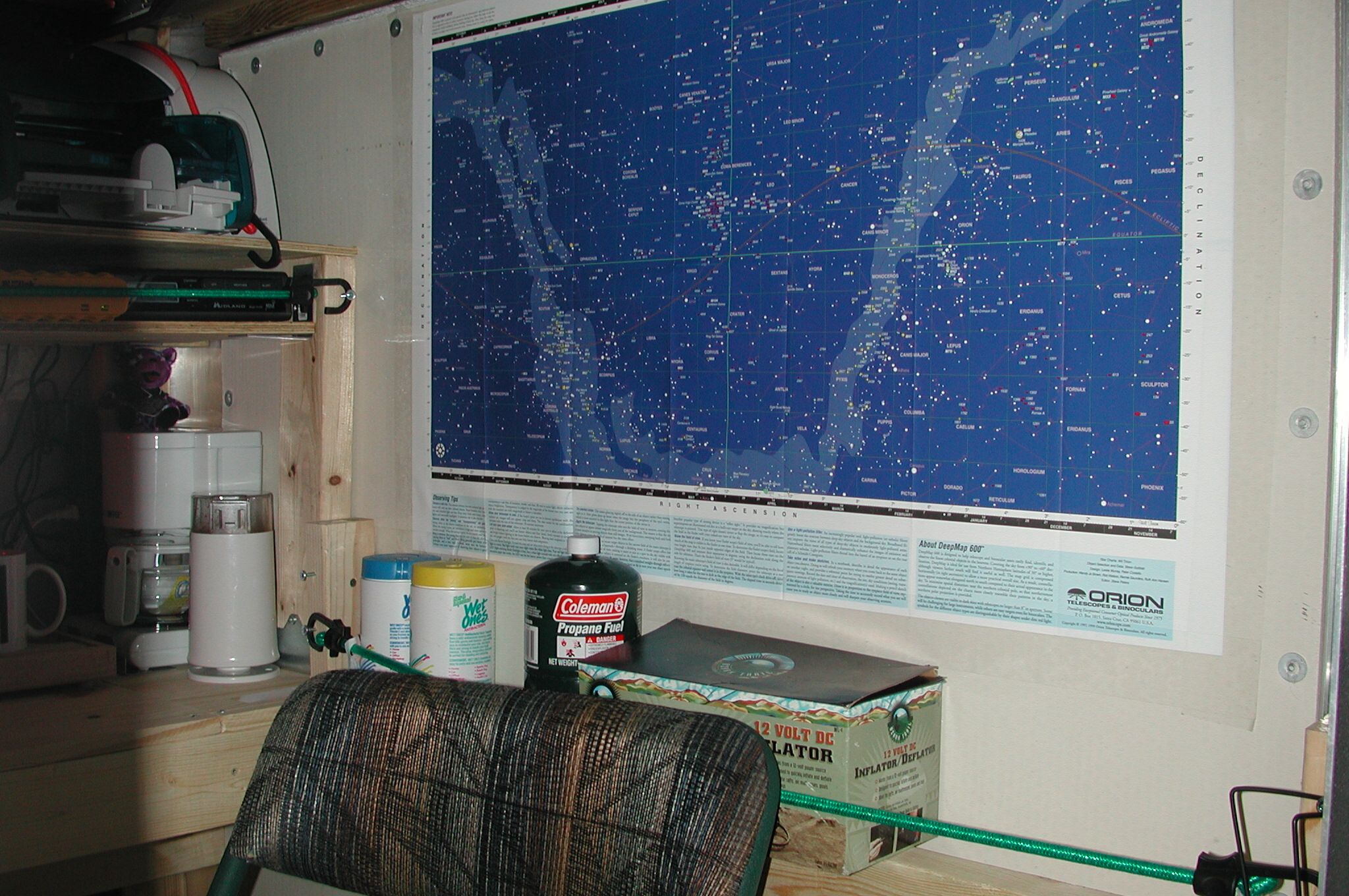 I actually wound up with plenty of table space, room for charts and sketching etc. The office compartment will have a blind which can be pulled down to block light escaping to the rear and to allow for privacy if changing clothes etc. There is a heating unit to warm up on those cold night sessions! The front wall sports a star chart and there is a coffee maker in the corner for those late nights. I plan on doing more work to hide wires and make the overall setup a little more comfortable. There is plenty of storage space below the tables where tents and other camping gear can be stored. The 16” might even fit in the office space for travel. Overall, it is truly amazing what one can pack into a 5’ x 8’ space, especially considering the framing for all this consumed a lot of space in itself. Overall I think I accomplished the goal of quicker observing when arriving to a site. I hope to test it all soon! | |||||||||||||||||||||||||||||||||||||||||