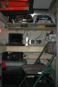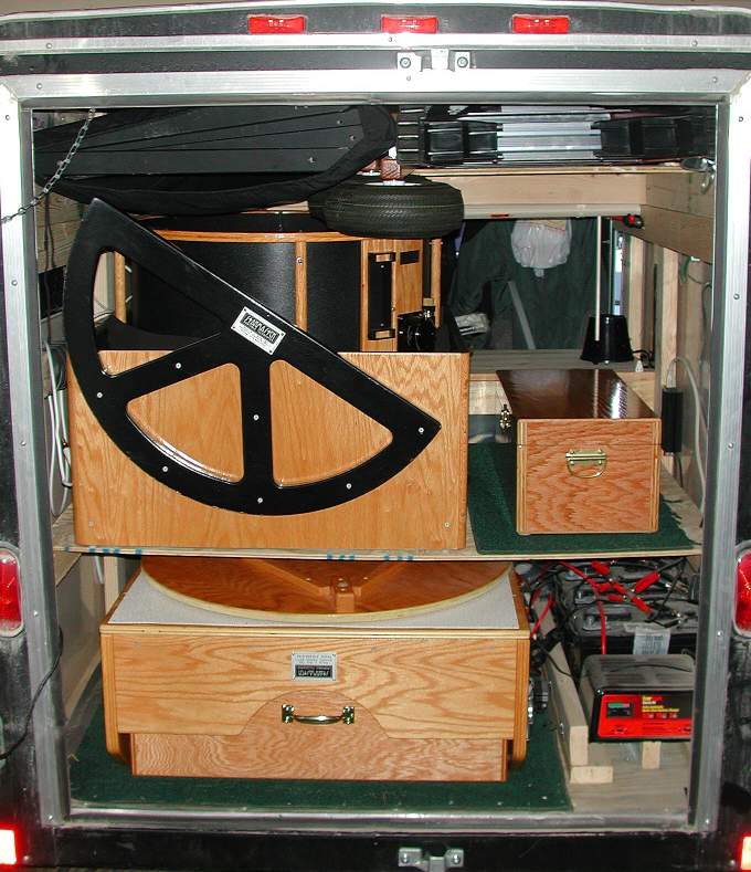 The rear was optimized so that the equipment could stack thus using the full height of the trailer. On the bottom the mirror box and rocker box sit atop carpet, to the right is the 345 AMP Hour Deep Cycle power system and charger. The power system feeds three inverters which control various outlets in the trailer. The middle shelf holds the mirror box and top cage. The top shelf, barely visible, houses the latter and truss polls. The middle shelf doubles as a spacious observing table while view the stars. Plenty of room for star charts, laptop etc. Space conservation was the main game on this project. | |||||||||||||||||||||||||||||||||||||||||